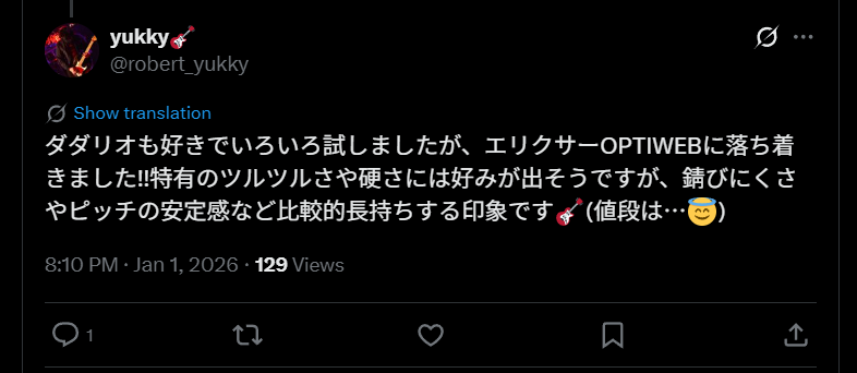 エリクサー弦は特にこだわりなければ長寿命のOPTIWEBを選ぶのがおすすめです。