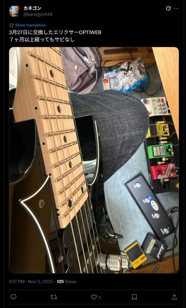 趣味で少しギターを弾く程度ですけど、NANOWEBを使っていた頃は弦の剥がれ、黒ずみが目立ってきて1~2か月で弦交換していました。